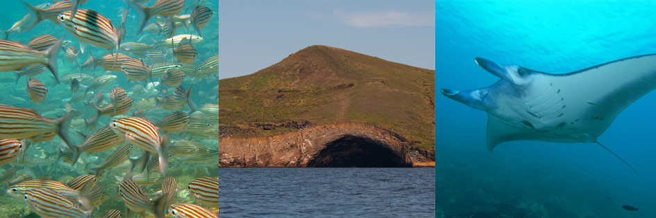 Sharks, tropical fish, turtles, manta rays (occ.), hammerhead sharks, spectacular rock formations; sea birds: blue- footed boobies, Nazca boobies & frigate birds. |