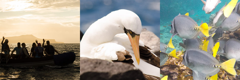 Nazca boobies, red-footed boobies, swallow-tail gulls, mangroves, coral pebble beach, snorkeling: rays, colorful reef fish, and hammerhead sharks occasionally |